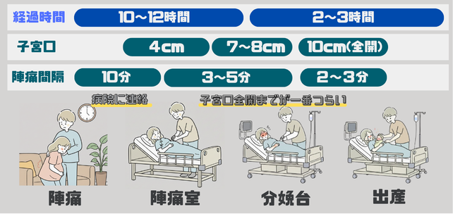 ※この図は初めての出産にかかるおおよその時間です。個人差や出産の経験により時間は前後します。